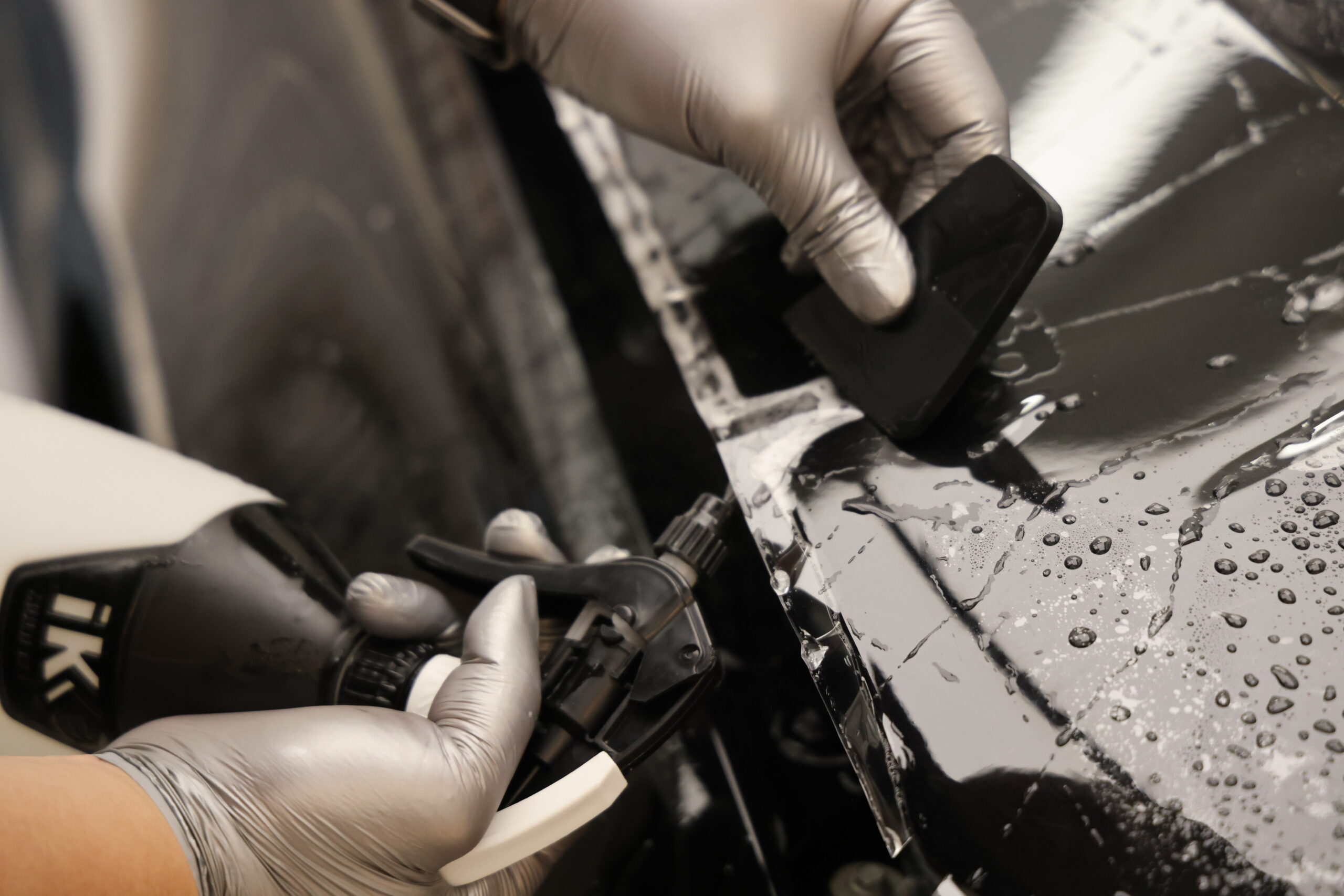 在貼膜前,我們先為車漆塗抹一層高穩定性的陶瓷塗層。這層膜料不僅能填補漆面微孔,更能與原漆產生強大的分子鍵結,避免日後撕膜時傷及金油層。